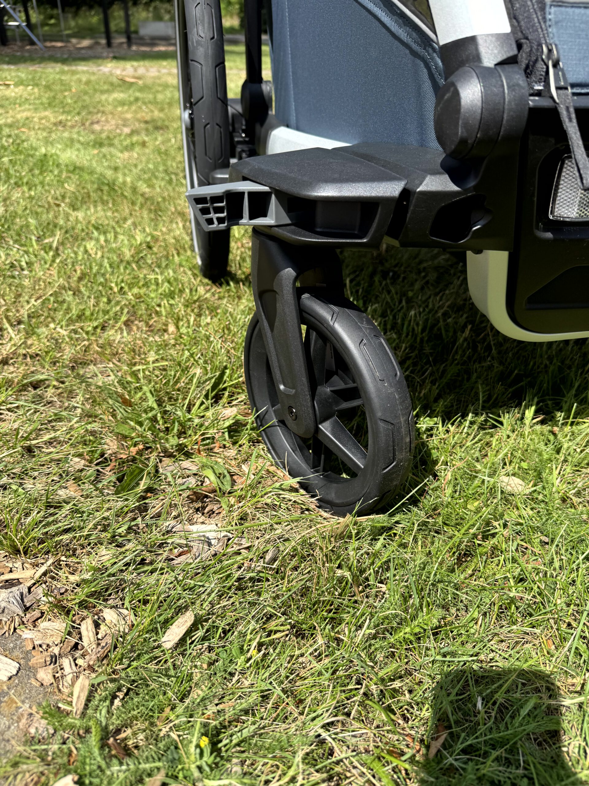 Blitzschneller Moduswechsel: Das FlipWing-System ermöglicht das einfache Umschalten zwischen Fahrrad- und Joggermodus, auch wenn der Anhänger am Fahrrad befestigt ist — die Vorderräder lassen sich um 180 Grad drehen, ohne sie auszubauen.