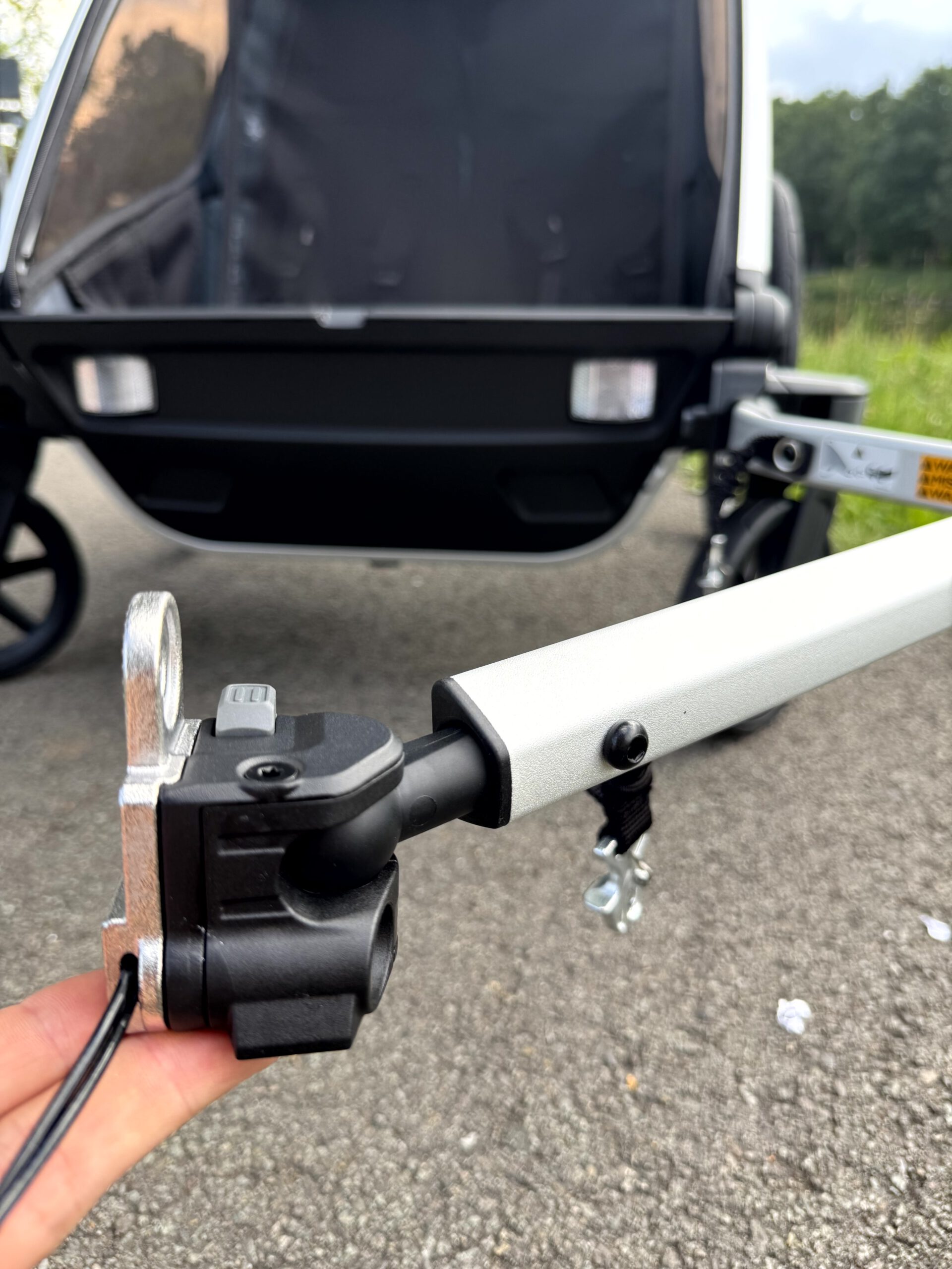 Einhand-Befestigung: Die neu gestaltete Deichsel wird in nur zwei Schritten angebracht, verriegelt mit einem Klick und integriertem Schloss für mehr Sicherheit.